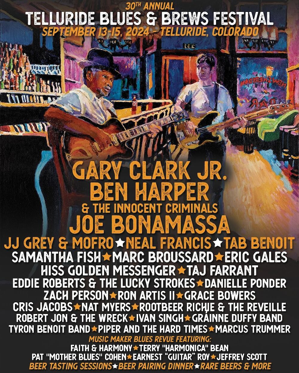 Tickets for the 30th-anniversary edition of the Telluride Blues & Brews Festival are on sale now, but they won’t last long! With a lineup featuring top artists like Gary Clark Jr., Ben Harper & the Innocent Criminals, Joe Bonamassa, and many more, this is an event you won’t want to miss. Mark your calendars for September 13th to 15th, 2024, and join us at Telluride Town Park for an unforgettable weekend of music, beer, and mountain magic.