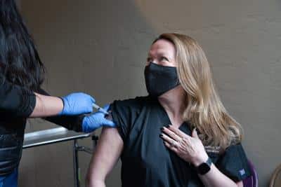 Dr. Diana Koelliker, shown in this 2020 Planet file photo receiving one of the first Moderna COVID-19 vaccines in the county, is the new interim CEO of Telluride Regional Medical Center, beginning on Monday. The Telluride Hospital District Board of Directors recently announced Koelliker is replacing former CEO Chris Darnell. (Planet file photo)