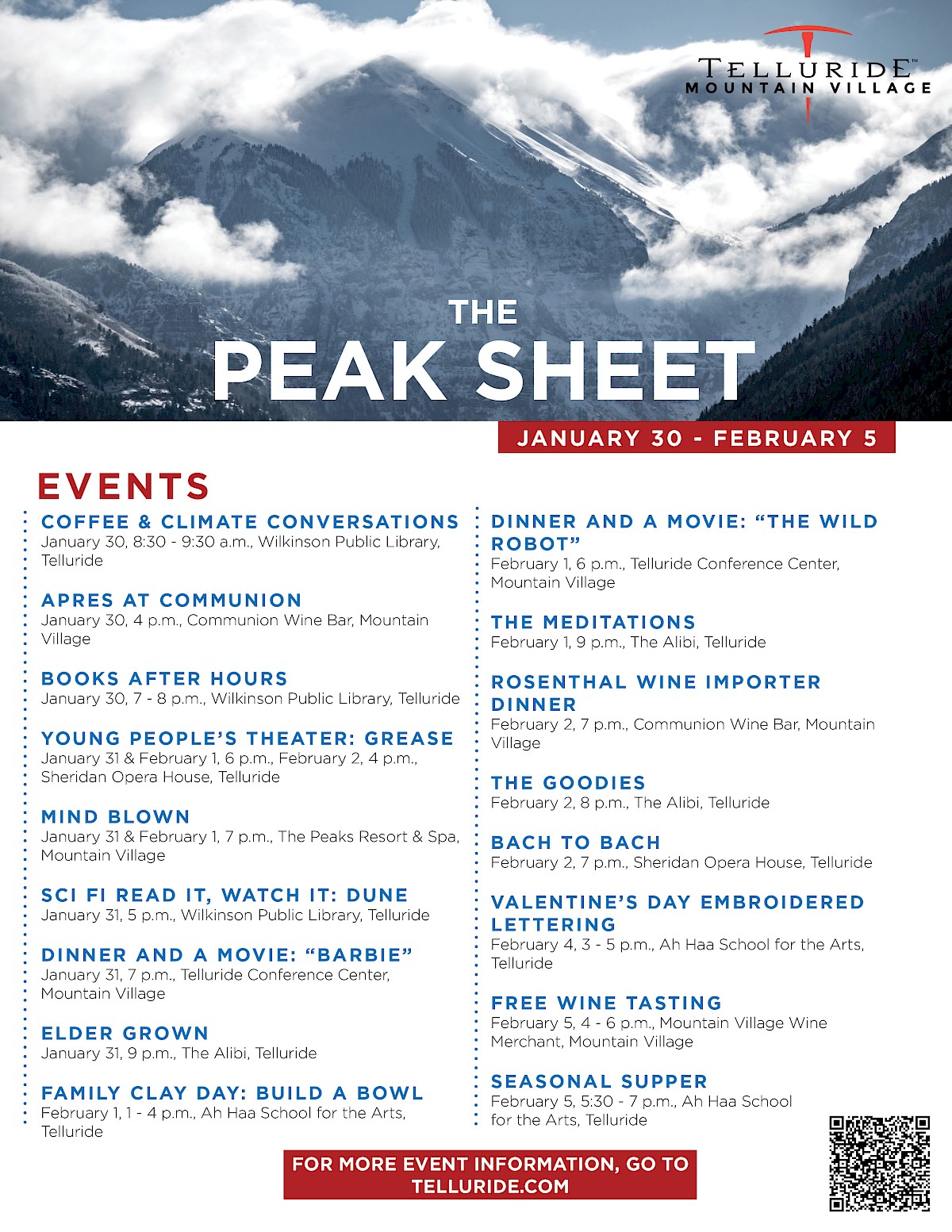 Other notable events include Books After Hours tomorrow at the Wilkinson Public Library, Mind Blown on Friday and Saturday at The Peaks, Dinner and a Movie with “Barbie” on Friday and “The Wild Robot” on Saturday at the Telluride Conference Center, and the Young People’s Theater’s production of Grease from Friday through Sunday at the Sheridan Opera House.