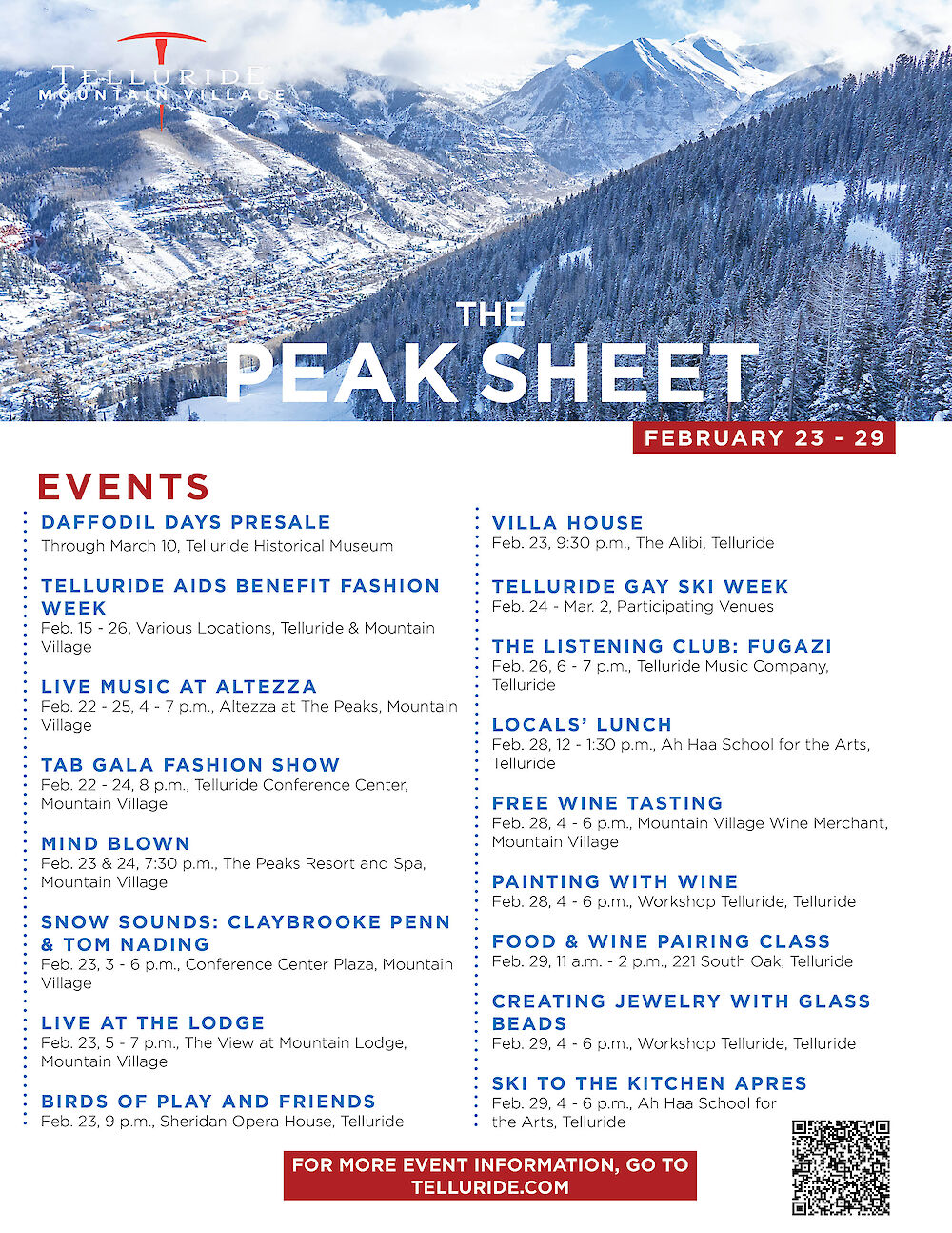 The sun is shining, there’s a storm in the forecast for next week, and we have SO many amazing events going on around town to close out the month (yes, this is the last Peak Sheet of February)! Enjoy the sunshine and soft snow.