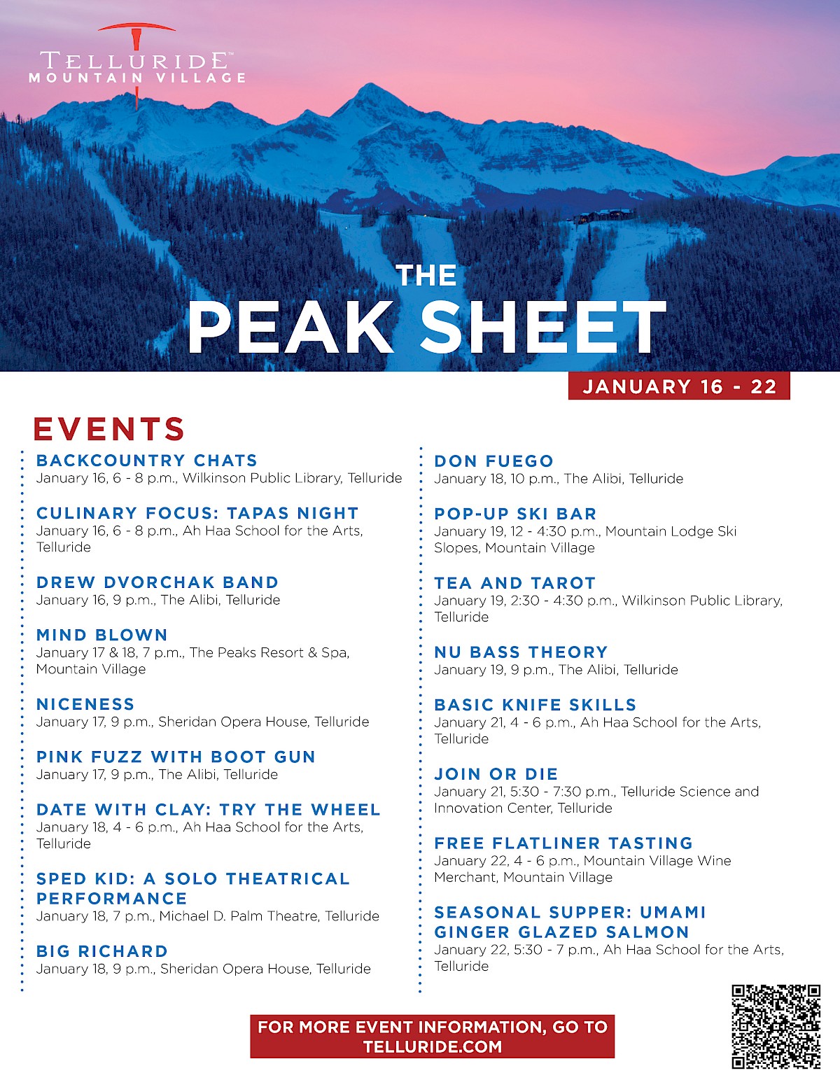 If deep thinking is more up your alley, head to the Michael D. Palm Theatre on Saturday for Sped Kid: A Solo Theatrical Performance (presented by TASP), catch “Join or Die” at the Telluride Science and Innovation Center on Tuesday (presented by Original Thinkers and Telluride Science), or head to the Wilkinson Public Library tomorrow for January’s edition of Backcountry Chats.