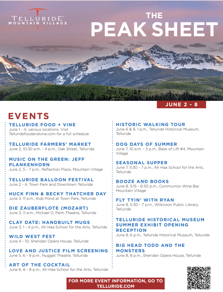Friday is a big day this week – Music on the Green starts for the season in Mountain Village with Jeff Plankenhorn and the Telluride Farmers’ Market returns to Oak Street! Be sure to shop local and support your neighbors and friends.