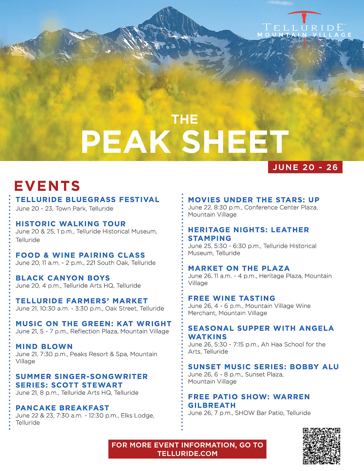 Thank you for diving into this week’s Telluride Peak Sheet! With the 51st annual Telluride Bluegrass Festival and a plethora of other exciting events, this week promises unforgettable experiences. Whether you’re savoring the music, indulging in fine wines, or exploring the vibrant community activities, Telluride offers something special for everyone.