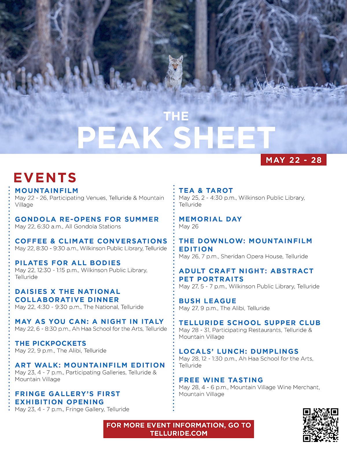 Foodies will enjoy a Collaboration Dinner tomorrow night with Daisies Chicago and The National (at The National), and the Telluride Education Foundation has teamed up with the local hospitality community for a supper club fundraiser from May 28-31. Plus, free wine tastings are back at the Mountain Village Wine Merchant starting next Wednesday.