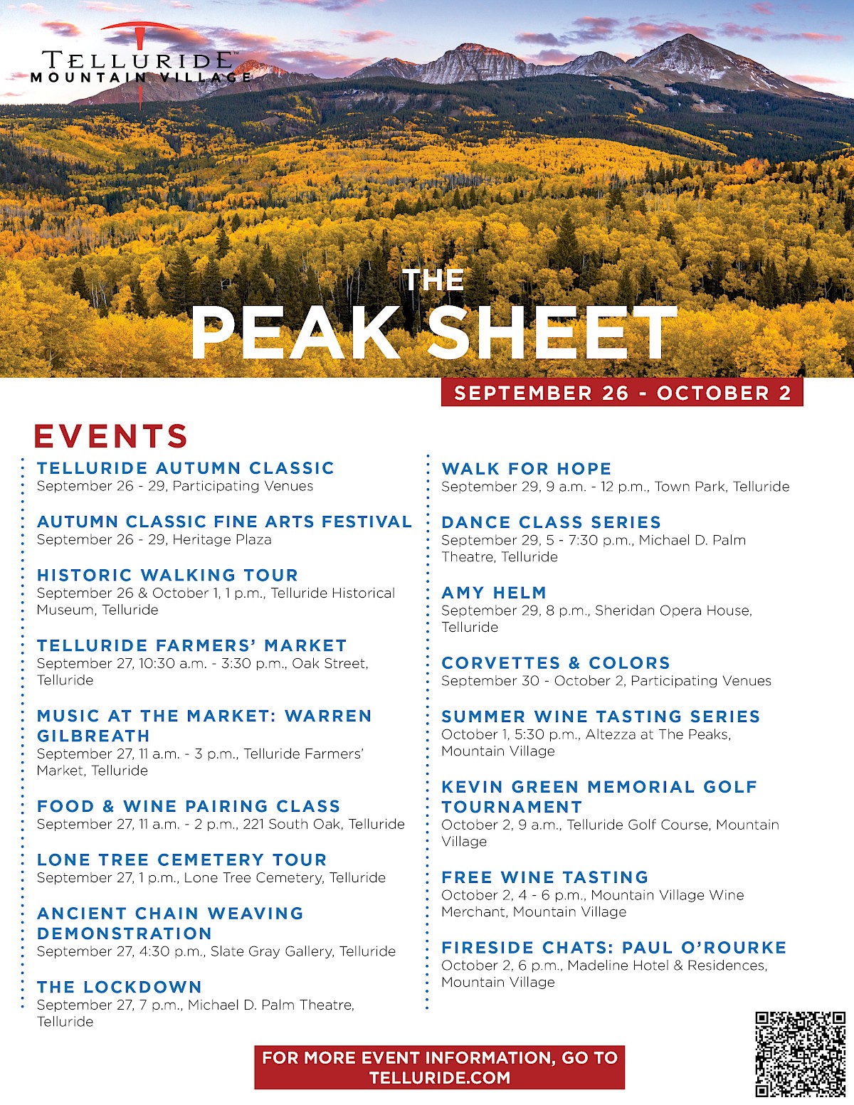 A great event that coincides with the colors, the Telluride Autumn Classic, starts tomorrow and runs through the weekend. Check out the cool cars at all of their events or head to their Fine Arts Festival in Heritage Plaza (or do both!). Following that event, Corvettes & Colors will be taking over town from Monday through Wednesday.